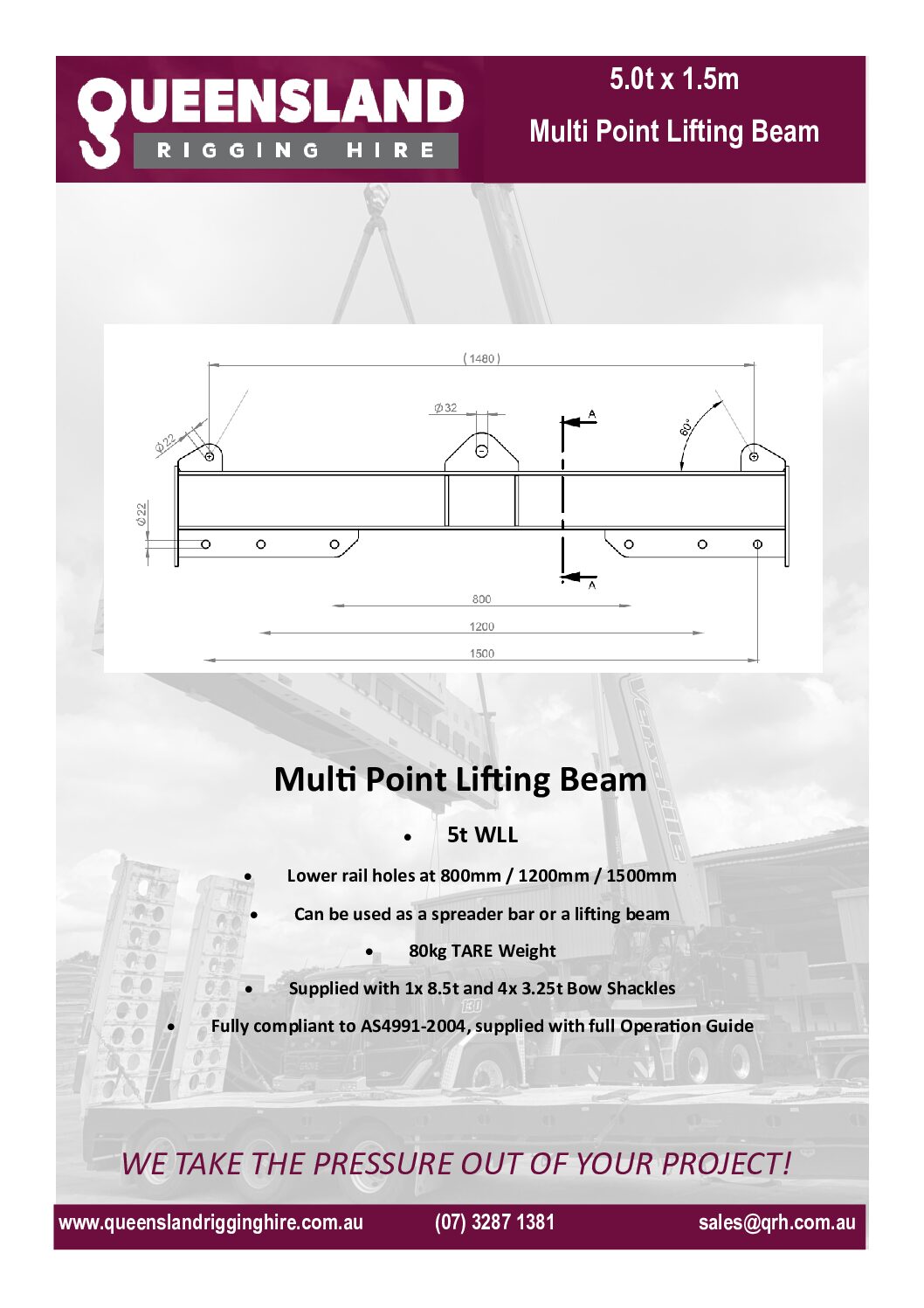 Queensland Rigging Hire has a selection of heavy duty lifting beams with multi point bottom rails for versatility. Some of our heavier telescopic combination spreaders also have a rated centre lifting point.